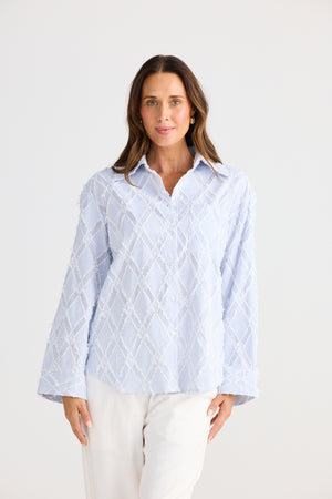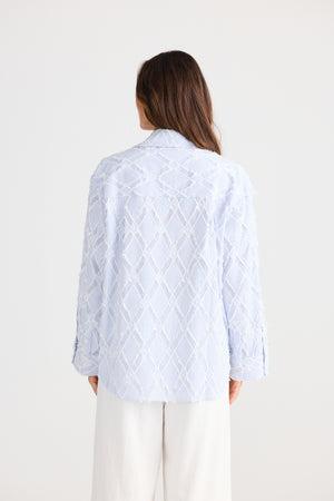 The Lleyton Shirt features a soft blue and white pinstripe design enhanced with delicate Chantilly lace in a diamond pattern. This fresh and effortless piece adds a playful touch to your everyday jeans, perfect for spring and summer. Crafted from breathable, genuine cotton, it combines comfort with style for a standout look.
