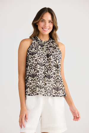 The Margot Top Spring Fan offers a chic cotton design ideal for both casual summer days and professional settings. Featuring a relaxed fit inspired by the popular Margot dress, it showcases an elegant Art Deco black and tan fan pattern that effortlessly elevates your wardrobe.
