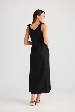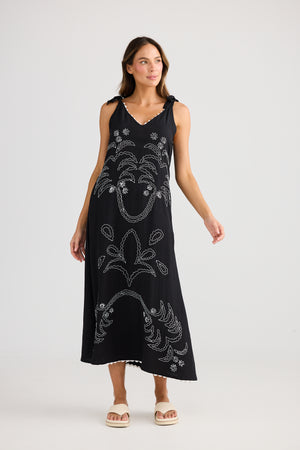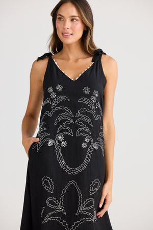 The Palms Embroidery Dress features a minimalist slip design with a V neckline and shoulder tie straps. Crafted from black linen with white palm embroidery design. Sticking and simple for hot summer days.