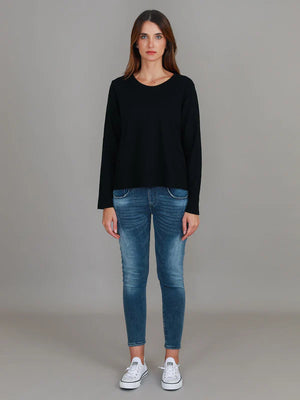 Experience ultimate comfort with the Sonya long sleeve T-shirt. Made with soft cotton jersey, this mid-length shirt features a classic crew neck, wide hem, and long sleeves for a versatile and stylish look. Perfect for any occasion, the Sonya T-shirt offers both comfort and style.