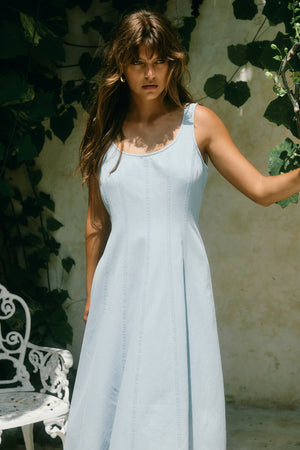 Sofie Denim Tank Dress in Sky blue denim. This dress showcases a flattering fit-and-flare silhouette that enhances your natural shape while offering comfort and style. Made from 100% cotton denim, it provides breathable wear perfect for sunny days and casual outings.