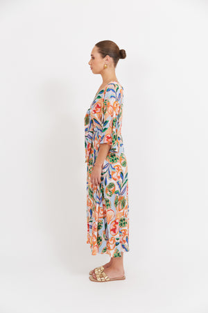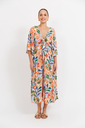 The Baja Tie Midi Dress features a breezy, lightweight design ideal for summer. Its coastal-inspired print and tie-front detail make it a versatile choice for beach days, resort vacations, or smart casual outings. Embrace effortless style and comfort wherever you go.