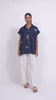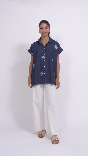 The Montego shirt from spring summer collection by The Haven Co.  A fresh chambray denim shirt with a white palm print. This relaxed summer top can be styled with our wide leg linen pants or the matching Montego short.