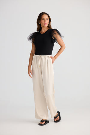 Embrace effortless elegance with this stunning tee featuring delicate tule cap sleeves. Perfect for dressing casually with jeans or elevating your look paired with our dazzling sequin pants. The ultimate evening T-shirt