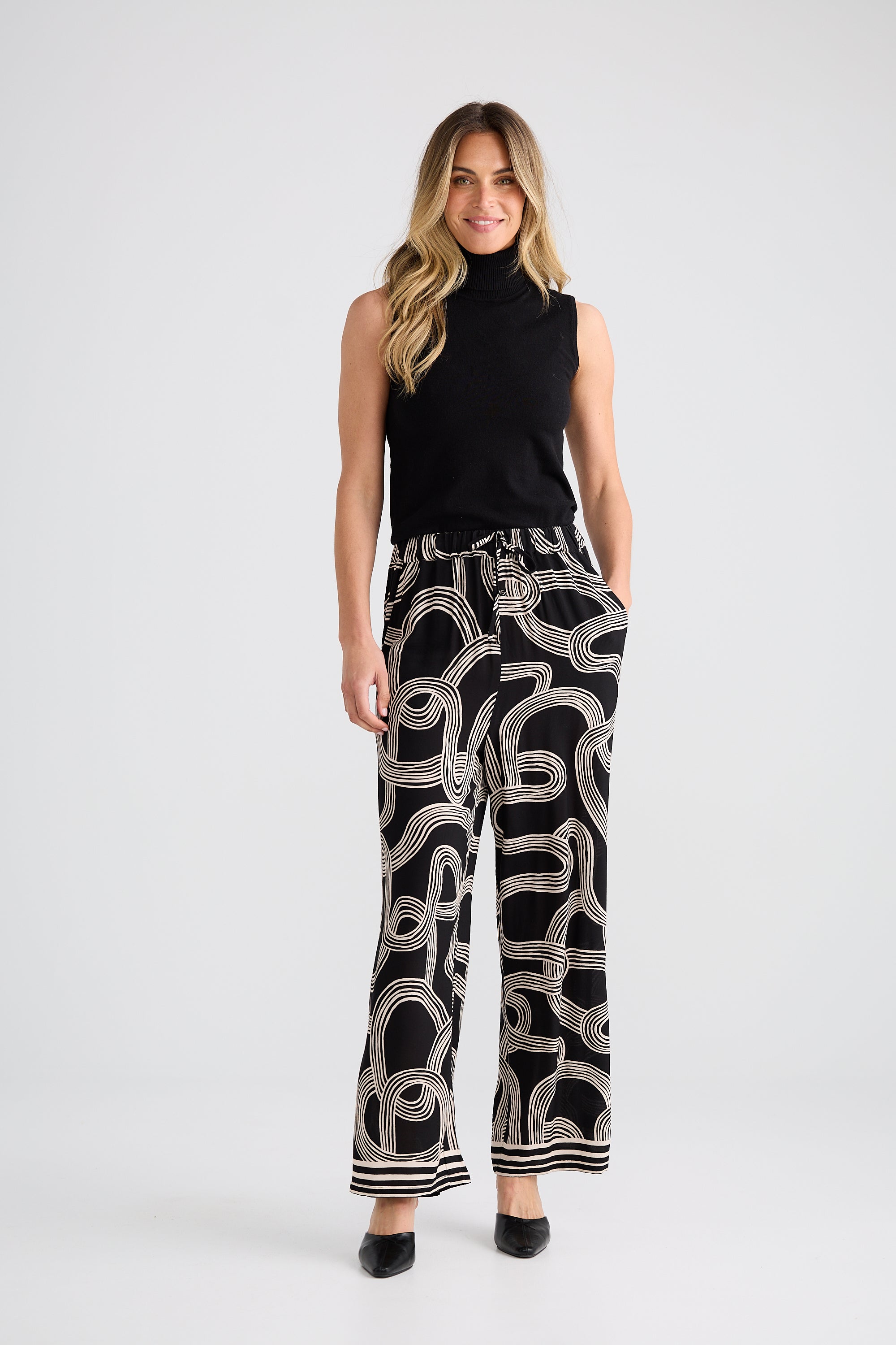Meet the Glenda Pant—where understated elegance meets a dash of personality. Crafted in sumptuous soft fabric, this season's must-have features an exclusive ink line print that transforms a classic silhouette into something wonderfully distinctive. A-line cut, timeless appeal, and just the right amount of character. Perfect for those who refuse to blend in.