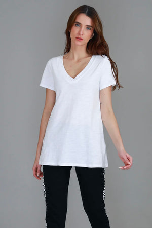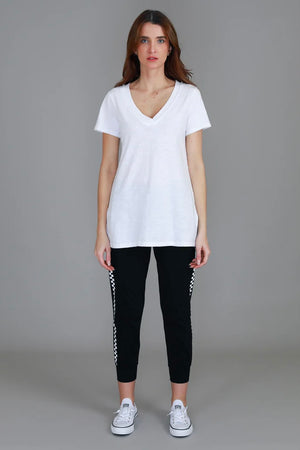 The Frankie Tee is your classic wardrobe staple in a relaxed, boxy silhouette. This staple t-shirt is made from 100% cotton and features a deep V-neck and split hem detail. We’ll be wearing ours on repeat with jeans or joggers.