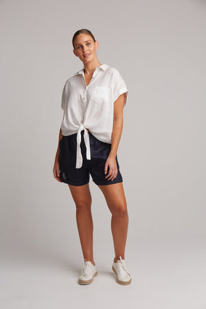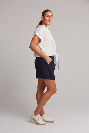 Elevate your style with our Studio Tie Front Linen Shirt in Black. This versatile staple is perfect for both work and casual outings. The tie front detail adds a touch of sophistication, while the lightweight linen fabric keeps you cool and comfortable. Look smart and feel confident in this must-have piece!