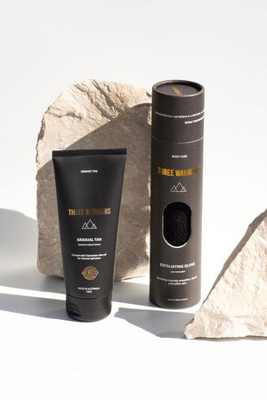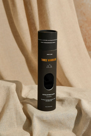 Wet the exfoliating glove thoroughly. For a better result you use in combintation with a small amount of Three Warriors Tasmanian Sand Scrub.