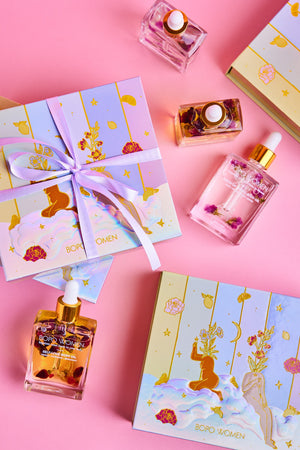 The Floral Fling Gift set pairs our two best-selling body oils in adorable 50ml versions. The Self-Love Body Oil and Seeds Of Spring Body Oil are packaged together to make the perfect gift ensemble. Gold foil details and pearlescent clouds give the packaging a truly magical feeling.