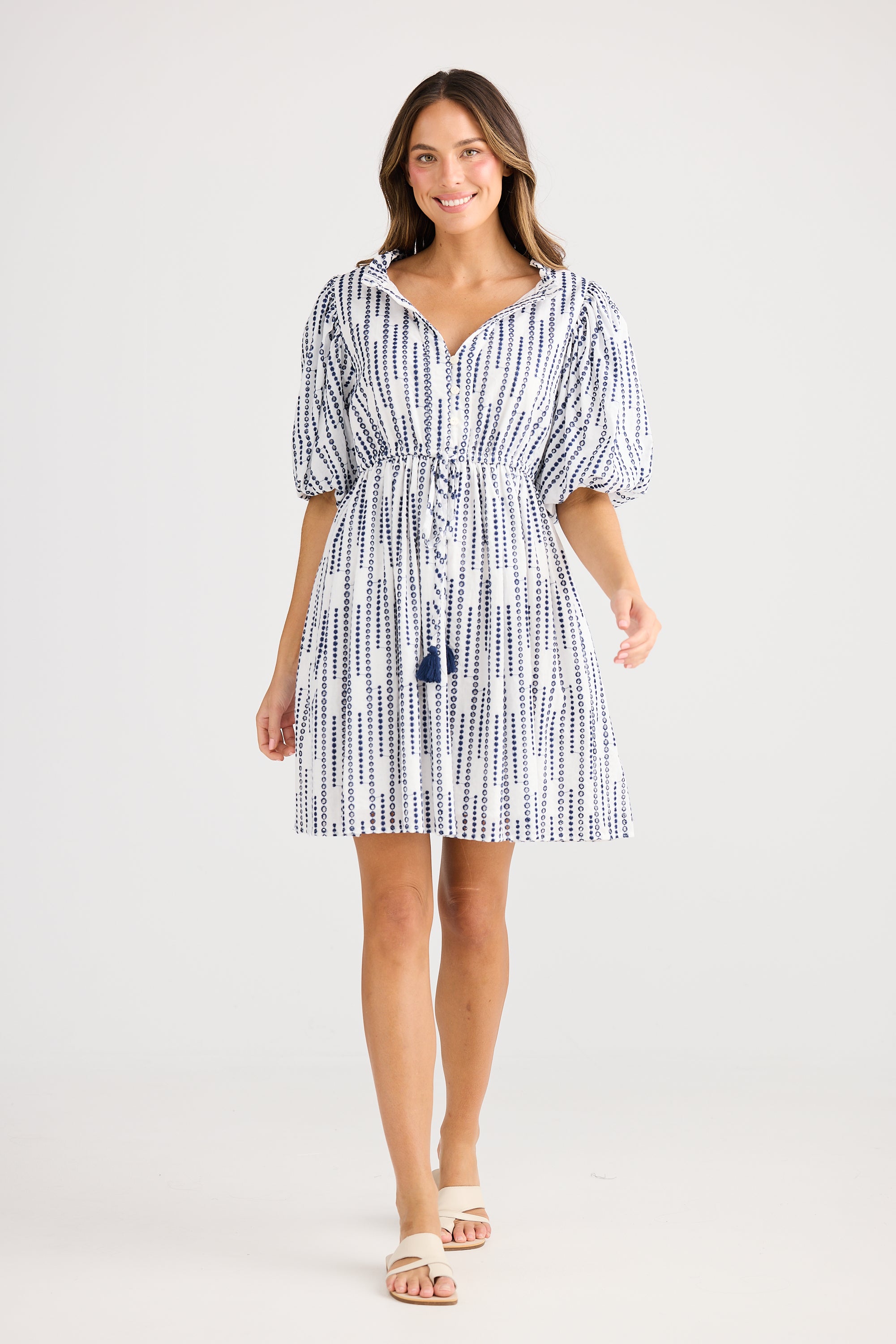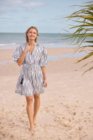 The Island Time Dress is a mini sun dress perfect for summer gatherings, parties, barbecues, and travel. With its unique textured topstitch accents and a flattering tie waist, this dress offers a stylish yet comfortable look that keeps you effortlessly chic throughout the season.