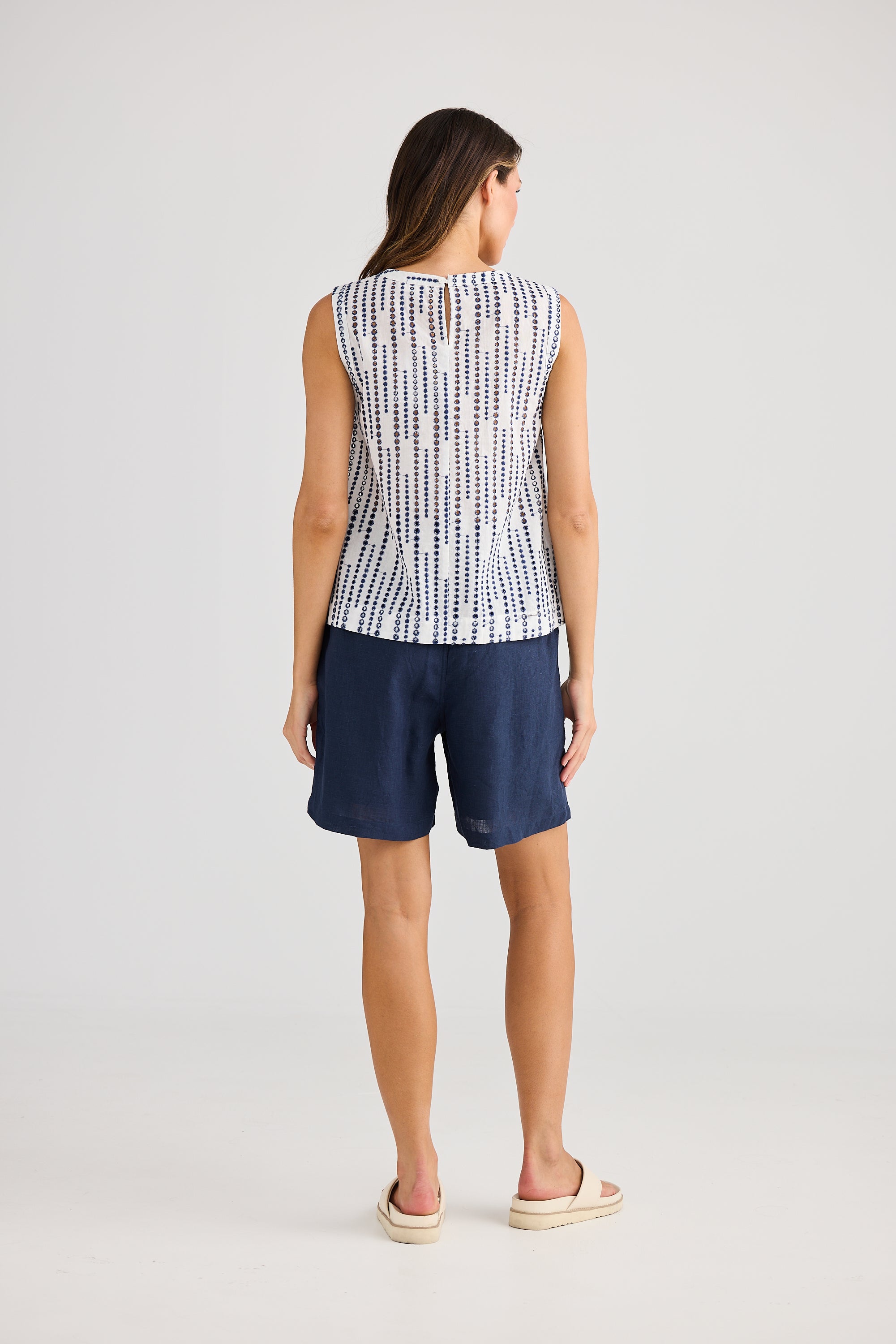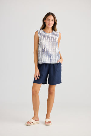 Discover the Playa Tank, featuring a clean, shell-shaped silhouette. Its standout element is the fabric—a navy cotton jacquard with a playful bubble pattern. Perfect for both work and special occasions, this top pairs effortlessly with fresh white and navy polka dots for a stylish, versatile look.