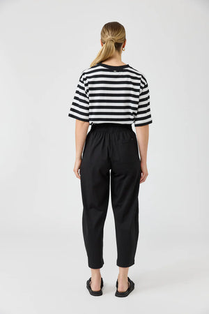 Designed for on-the-go comfort, the Traveller Pant in Black Ebony is a versatile and must-have addition to any wardrobe. Made from 100% cotton, it boasts natural softness and features a wide shirred elasticated waistband, functional pockets, and a relaxed straight leg. Its cropped length adds a modern touch, making it the perfect choice to pair with your favorite sneakers for effortless travel style.