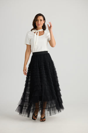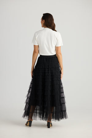 Returning Spring 25 -Turn heads in the Chance Skirt by Brave + True from Autumn Winter. Featuring black tulle, this glamorous skirt adds texture and decadence to any evening or event look. For a sexy day or night outfit, pair it with a simple tee.