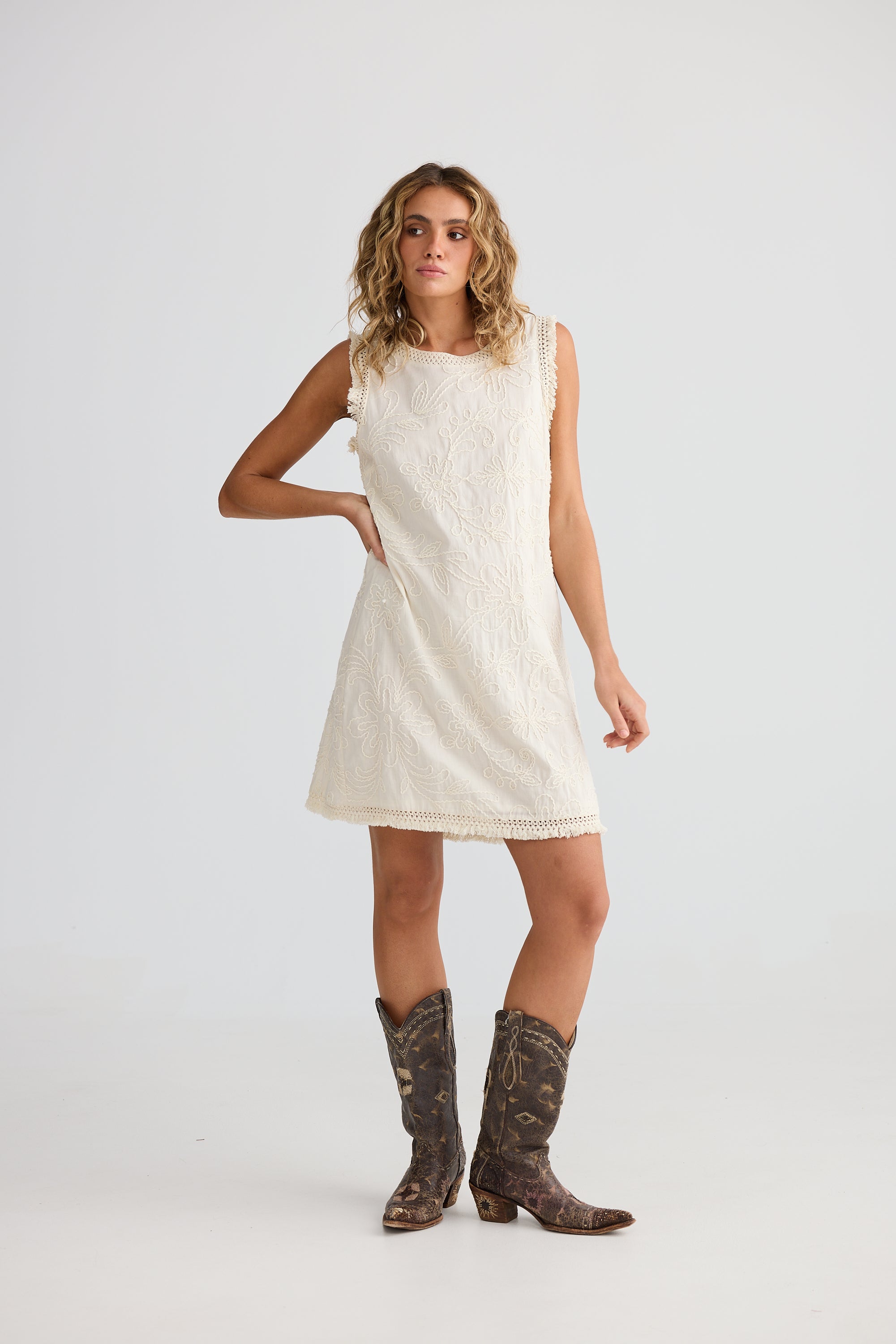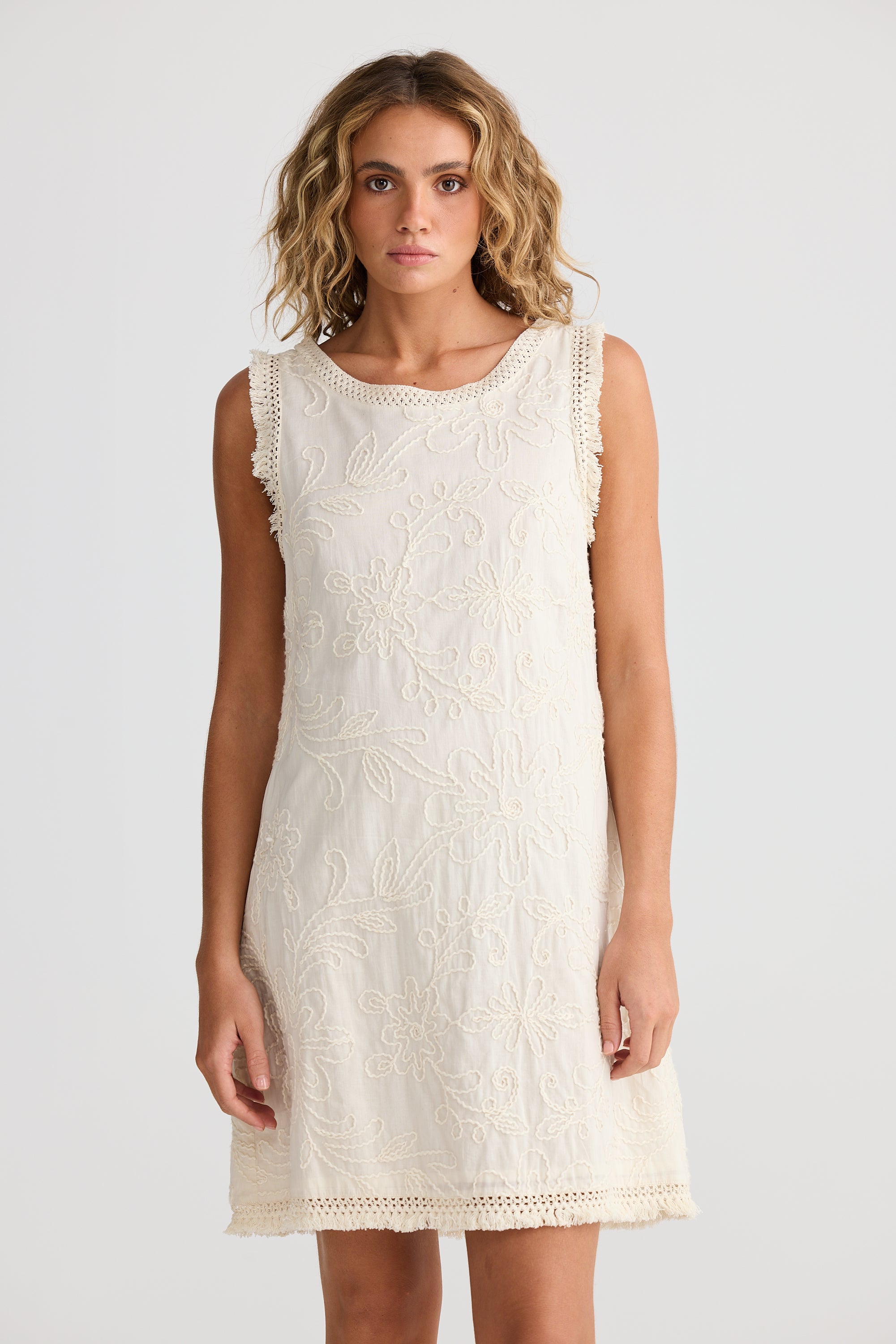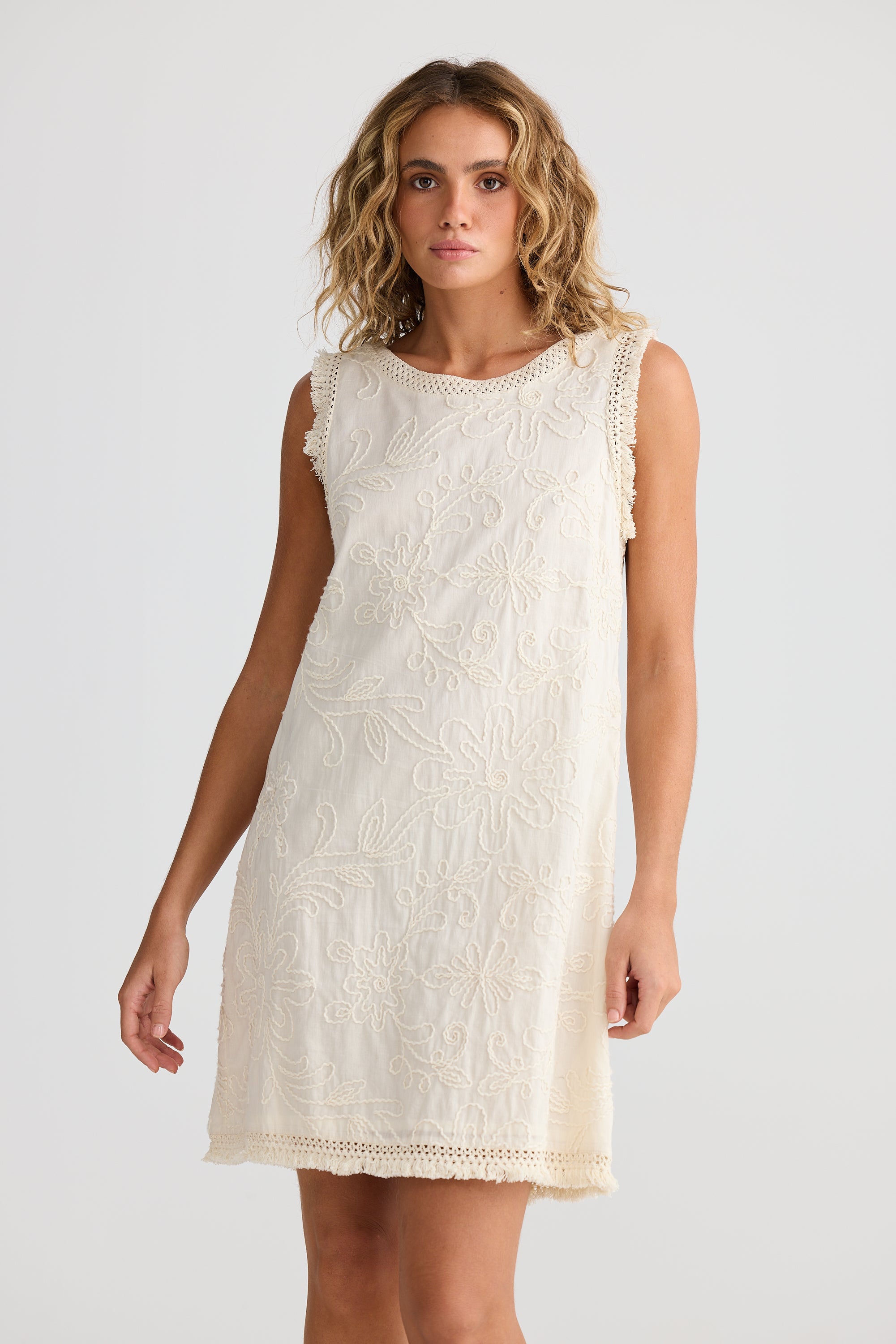 Embrace a romantic boho style this summer with the Chantilly Dress by Talisman. This dress showcases delicate, feminine embroidery on a gentle ivory fabric, making it a graceful addition to your holiday collection. Elevate your look with this effortlessly elegant piece.