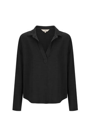 Introducing the Stevie Top in Black - a perfect blend of elegance and comfort. Thoughtfully designed for both travel and relaxed days, this sophisticated long-sleeved top features a deep v-neckline and smart collar for a polished yet effortless look. Crafted from a blend of bamboo, organic cotton and spandex, the luxuriously soft and thick fabric offers warmth and durability. The curved hemline adds a refined touch, making it a timeless staple you'll wear on repeat.